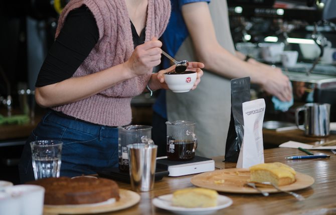 I feel that in Prague you see more people with plastic cups, and there are espresso bars where one just doesn’t sit at all. But in Brno people sit even in Monogram which is a small espresso bar. Or they stand while drinking it, but they stay there for some time.
