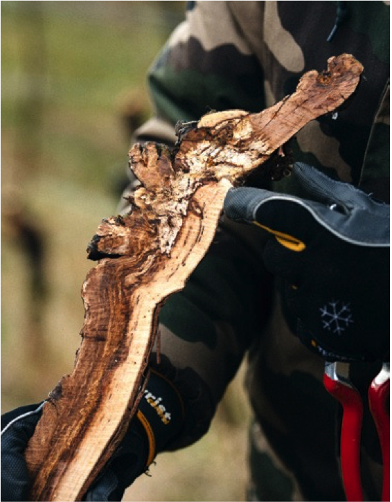ESCA attacks a plant’s vascular system, making it impossible for the plant to transport water and nutrients from the soil, causing it to wither. Plants with low amounts of infection can be chopped off at the trunk and regrown, more severely infected plants need to be replaced entirely.